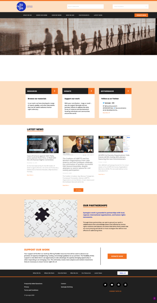 Synergía is an organization advocating for LGBT human rights. They are composed of a distributed team focused on key areas of Northern Africa, Latin America, and the Caribbean. Among advocacy organizations they are unique because they bridge grassroots and high level international groups. Synergía had a web presence under a larger organization in the past, but has recently become an independent entity, and therefore needed its own web presence.
